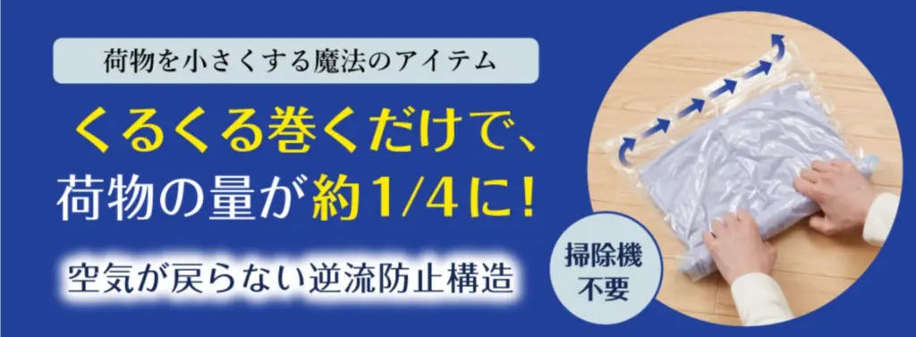 掃除機やポンプを使わず、くるくると巻くだけで衣類を圧縮できる手軽さが最大の特徴。それでいて100円ショップの製品とは一線を画す耐久性と密閉力を備えています。