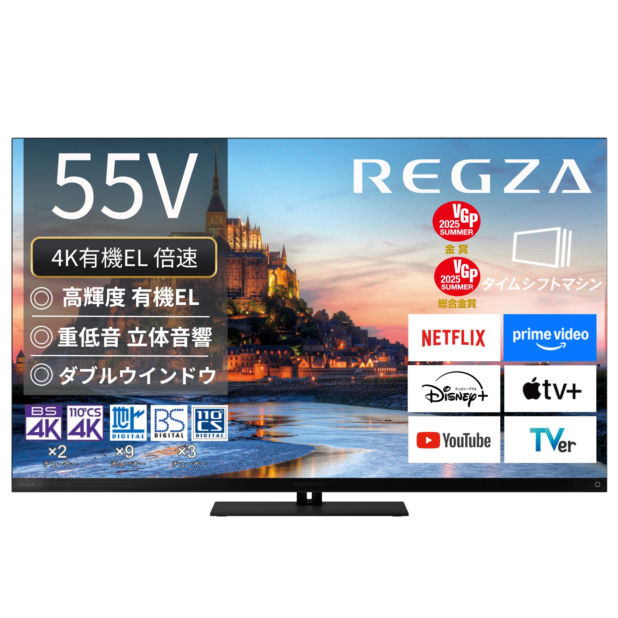 REGZA X9900Rは、画面サイズ55V型と65V型の2モデルでラインナップされ、両モデルとも2025年5月23日に同時発売されました。両サイズで共通する仕様と、サイズ別に異なる物理的・電気的スペックを以下にまとめます。